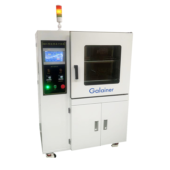 首先设定烘箱工作温度,典型的预处理程序为∶打开真空泵抽真空,待腔内真空度达到5000Pa后,开始充入氮气,充到90000Pa后,再次进行抽真空、充入氮气如此往复吹扫净化腔室,到达设定的吹扫次数后,再次开始抽真空到2000Pa,充入通过氮气鼓出的HMDS气体,在到达设定时间后,停止充入HMDS 药液,进入保持阶段,使硅片充分与HMDS 反应。当达到设定的保持时间后,再次开始抽真空。充入氮气如此往复吹扫清除HMDS残余,到达设定的吹扫次数后,完成整个作业过程。 |